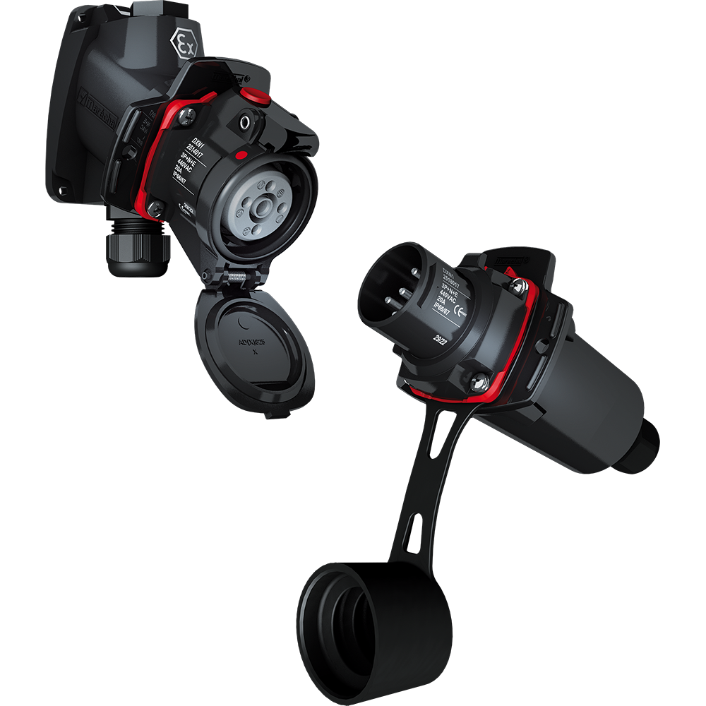 DXN DECONTACTOR ist eine kompakte Steckdose für industrielle Anwendungen mit integrierter Unterbrechungsvorrichtung für explosionsgefährdete Bereiche (Zonen 1, 2, 21, 22).